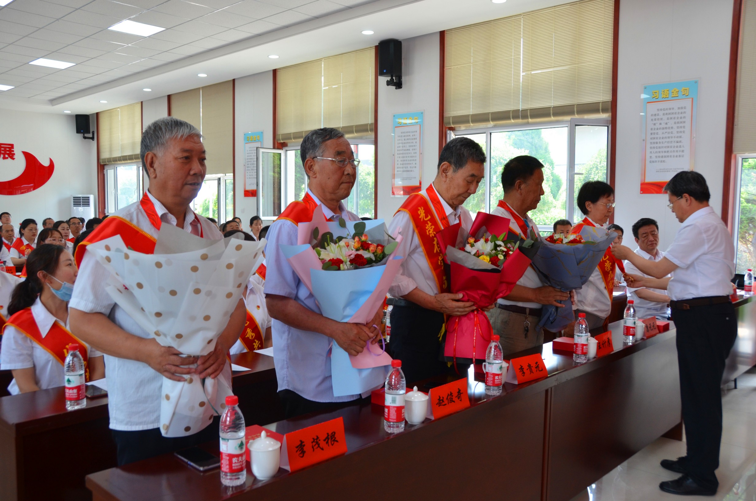 會(huì)上,為黨齡50年以上的5名老黨員代表頒發(fā)“光榮在黨50年”紀(jì)念章;由吳瑞峰同志領(lǐng)誓,新黨員代表重溫入黨誓詞;會(huì)議表彰了市工信(國資)系統(tǒng)優(yōu)秀共產(chǎn)黨員10名、優(yōu)秀黨務(wù)工作者10名和先進(jìn)基層黨組織5個(gè);表彰了市工信(國資)系統(tǒng)“學(xué)習(xí)強(qiáng)國”模范學(xué)習(xí)組織5個(gè)、學(xué)習(xí)標(biāo)兵10名和學(xué)習(xí)積極分子10名。集團(tuán)公司黨委、集團(tuán)公司押運(yùn)六公司黨支部被授予先進(jìn)基層黨組織和“學(xué)習(xí)強(qiáng)國”學(xué)習(xí)平臺(tái)模范學(xué)習(xí)組織榮譽(yù)稱號(hào);集團(tuán)公司守押一公司趙君、吳映強(qiáng)兩同志被授予市工信(國資)系統(tǒng)“學(xué)習(xí)強(qiáng)國”學(xué)習(xí)平臺(tái)“學(xué)習(xí)積極分子”榮譽(yù)稱號(hào)。