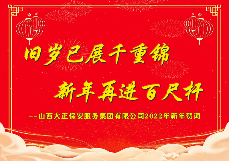 2022年是黨的二十大勝利召開之年,也是大正保安集團改革發(fā)展歷程中極為關鍵的一年。誠摯希望全體大正保安人能夠一如既往地用付出和堅守詮釋大正保安集團的責任和擔當,也誠摯希望各界朋友能夠一如既往地關心和支持大正保安集團的建設和發(fā)展,讓我們攜手同行、守望相助,守正篤實、久久為功,加快建設國內(nèi)一流的綜合型保安服務集團,努力在忻州全方位推動高質(zhì)量發(fā)展、奮力譜寫全面建設社會主義現(xiàn)代化國家忻州篇章的新征程中再創(chuàng)佳績,以優(yōu)異成績迎接黨的二十大勝利召開!