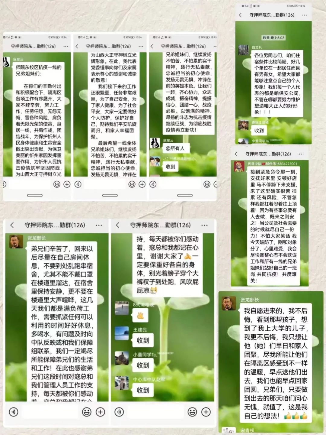 此外,頓村棚戶區(qū)、師院主校區(qū)、民兵應(yīng)急、醫(yī)療機(jī)構(gòu)、交通樞紐等其它五支突擊分隊(duì)全體參戰(zhàn)隊(duì)員在做好自身防護(hù)的前提下,積極配合相關(guān)單位履職盡責(zé)。在第二方艙醫(yī)院和龍崗二區(qū)、頓村棚戶區(qū)隔離點(diǎn)執(zhí)行外圍警戒的直屬公司和機(jī)關(guān)部門(mén)人員,不懼危險(xiǎn)、堅(jiān)守崗位,時(shí)刻保持高度警惕,輪班值守重要通道,嚴(yán)禁無(wú)關(guān)人員進(jìn)入隔離地帶、破壞隔離設(shè)施,確保隔離點(diǎn)和方艙周邊安全有序;在師院主校區(qū)、頓村棚戶區(qū)隔離點(diǎn)執(zhí)行餐食物資配送的機(jī)關(guān)部門(mén)和物業(yè)公司人員,不辭辛勞、上下奔波,及時(shí)把美味、可口、溫?zé)岬娘埐怂偷礁綦x人員手中,像一抹抹溫暖的陽(yáng)光,用溫情守護(hù)讓隔離人員安心、舒心;在市醫(yī)院、中醫(yī)院、忻州西站等處在執(zhí)行秩序維護(hù)的保安直屬公司人員,認(rèn)真把關(guān)、仔細(xì)查驗(yàn)進(jìn)出人員的“三碼一溫”,有力地保障了重點(diǎn)部位疫情防控期間的安全穩(wěn)定運(yùn)行。