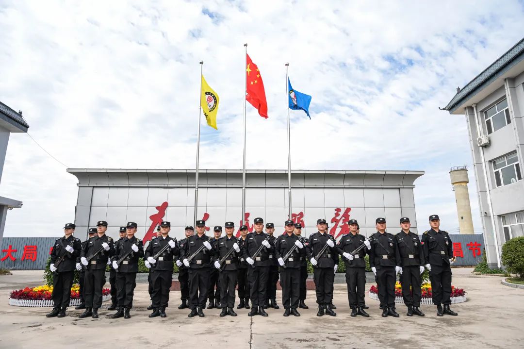 節(jié)日的公司院內(nèi)外,四周花團(tuán)錦簇,大門口燈籠高掛、彩旗飄揚(yáng),為節(jié)日增添了濃厚的喜慶氛圍。公司運(yùn)鈔車、巡邏車、運(yùn)兵車干凈整潔,排列在場地兩側(cè),升旗儀式更顯隆重。9時(shí)30分,集團(tuán)公司、各子公司領(lǐng)導(dǎo)和機(jī)關(guān)各部門、城區(qū)員工共300多人整齊列隊(duì),懷著激動(dòng)的心情,手持小國旗,臉上貼著愛國貼紙、洋溢幸福的笑容,眼神中充滿了對祖國的熱愛和對升旗儀式的期待。