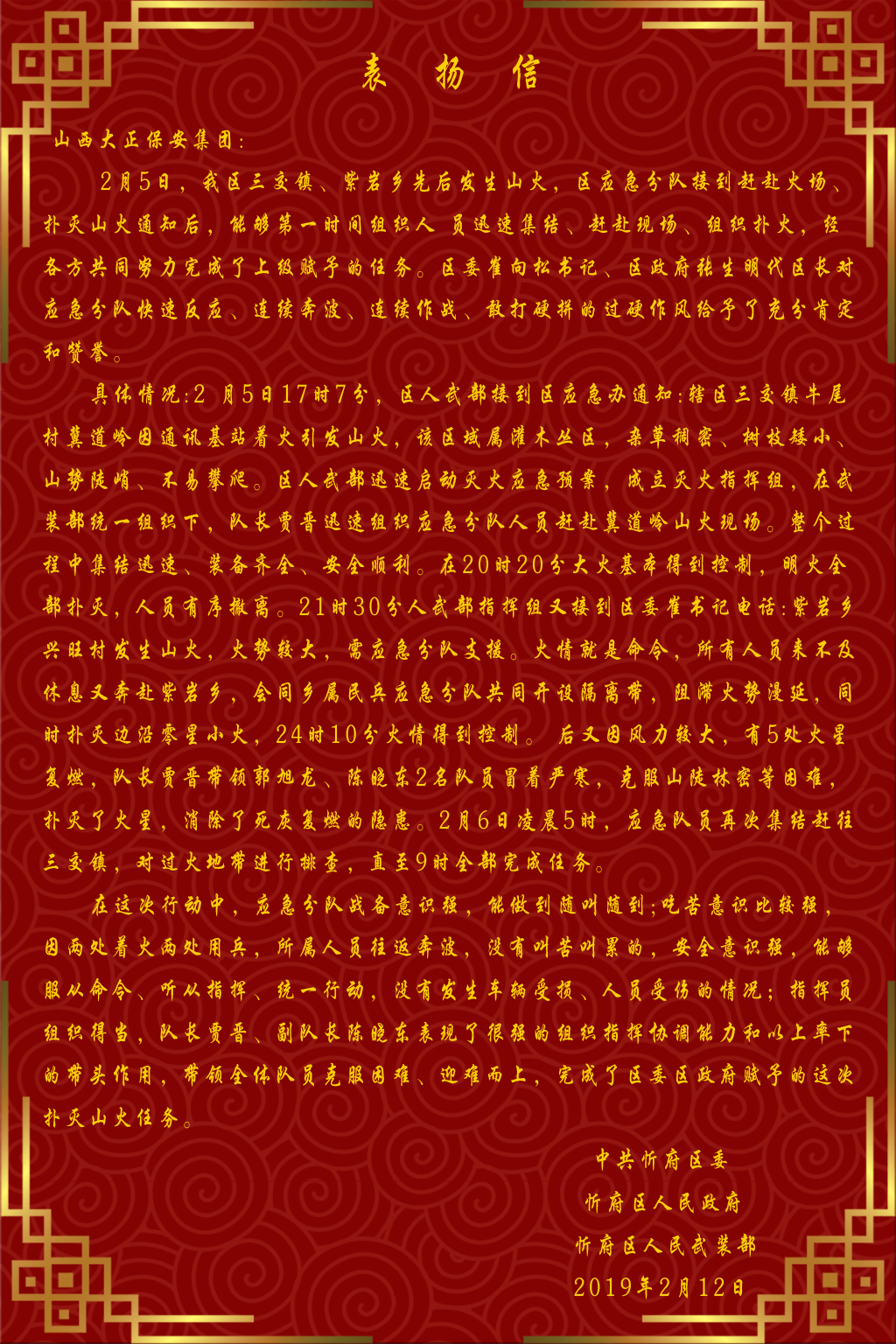 另外,2月5日,忻府區(qū)三交鎮(zhèn)、紫巖鄉(xiāng)先后發(fā)生山火,區(qū)應(yīng)急分隊(duì)接到趕赴火場、撲滅山火通知后,公司在第一時(shí)間組織應(yīng)急人員迅速集結(jié)、趕赴現(xiàn)場、組織撲火,全體隊(duì)員攻堅(jiān)克難、英勇奮戰(zhàn)、連續(xù)奔波、連續(xù)作戰(zhàn),經(jīng)各方共同努力圓滿完成了上級(jí)賦予的滅火任務(wù),得到了忻府區(qū)委崔向松書記、張生明代區(qū)長的充分肯定和贊譽(yù)。此外,中共忻府區(qū)委,忻府區(qū)人民政府,忻府區(qū)人民武裝部專程來公司送來表揚(yáng)信,對(duì)公司應(yīng)急隊(duì)伍完成此次救火任務(wù),展示了公司隊(duì)伍良好形象進(jìn)行了表揚(yáng)。