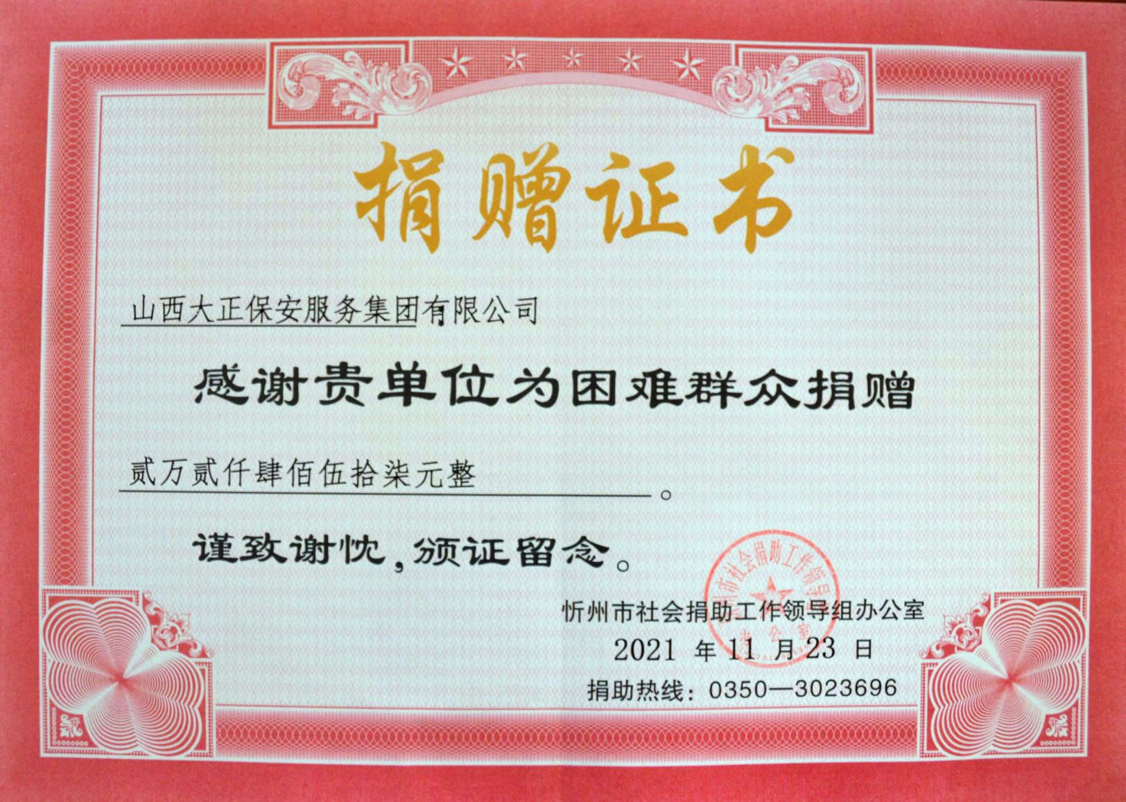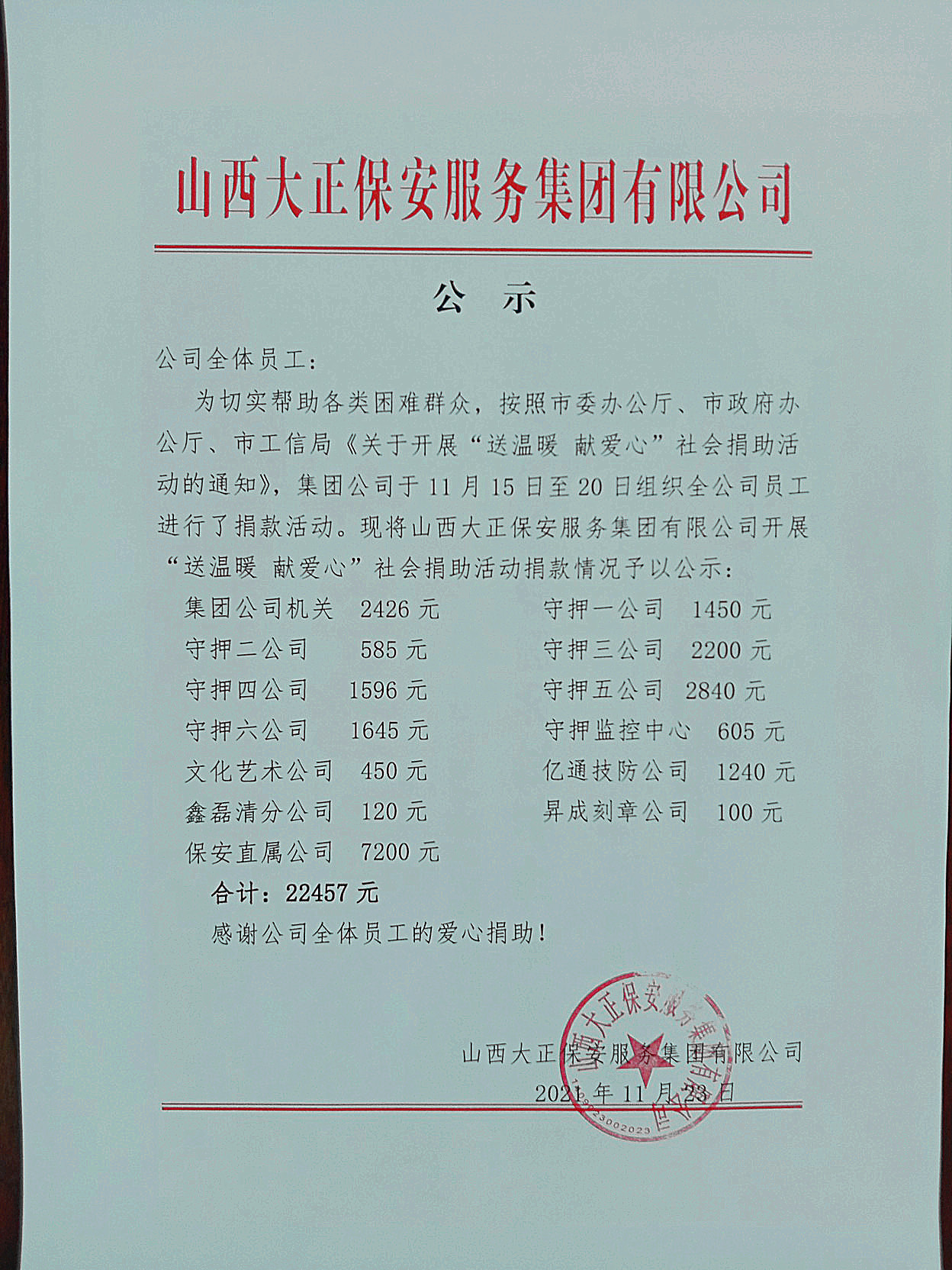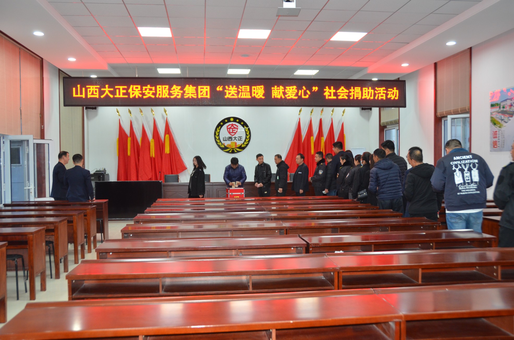 11月15日,集團(tuán)公司組織領(lǐng)導(dǎo)班子成員及總部駐地全體員工在大會(huì)議室參加了社會(huì)捐助活動(dòng)。本次捐助活動(dòng),彰顯了山西大正保安集團(tuán)廣大員工的奉獻(xiàn)擔(dān)當(dāng)精神,也激發(fā)了公司全體員工扶危濟(jì)貧的愛心,在全公司上下營(yíng)造了無(wú)私奉獻(xiàn)、助人為樂(lè)的濃厚氛圍。