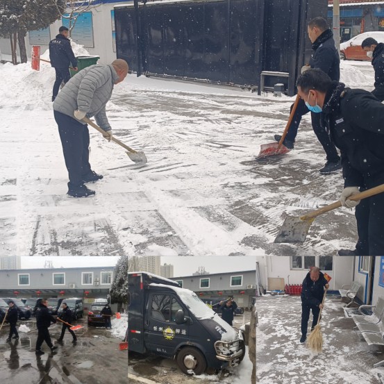 在各中隊安排早上出勤車輛有序出發(fā)后,經(jīng)理楊貴文充分發(fā)揮黨員先鋒模范作用,帶領(lǐng)各中隊員工齊上陣,投入到掃雪活動中,全體隊員不畏嚴(yán)寒,充分發(fā)揮了吃苦耐勞、頑強拼搏的戰(zhàn)斗精神,他們手中揮舞著鐵鍬、推鏟、掃把等勞動工具,干勁十足,經(jīng)過幾小時的努力,押運車輛、公司院內(nèi)及周邊道路的積雪全部清理干凈,保障了人員車輛的出行安全,為城區(qū)守押金融業(yè)務(wù)穩(wěn)定有序運行提供了強有力的安全保障。