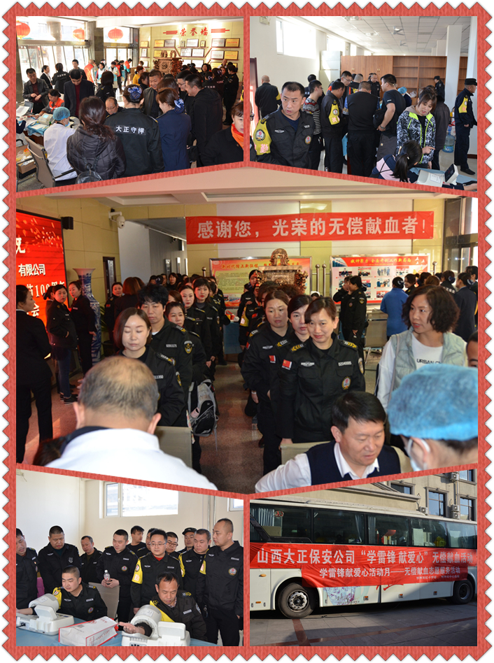 血液有限,愛心無限。3月7日和13日,山西大正保安服務(wù)有限公司與忻州市紅十字會、忻州市中心血站聯(lián)合開展了“學(xué)雷鋒 獻(xiàn)愛心”職工無償獻(xiàn)血活動,此次在總公司和分公司分別設(shè)立采血點(diǎn),提前發(fā)出倡議,營造良好聲勢。據(jù)統(tǒng)計(jì),公司參與本次獻(xiàn)血活動的員工志愿者約150余人,成功獻(xiàn)血的員工志愿者約100余人。