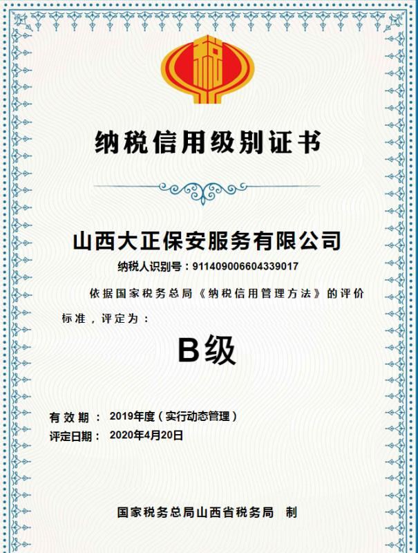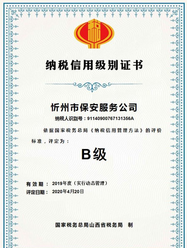 近日,山西大正保安服務(wù)有限公司和忻州市保安服務(wù)公司在國(guó)家稅務(wù)局忻州市經(jīng)濟(jì)技術(shù)開發(fā)區(qū)分局的2019年度納稅信用級(jí)別評(píng)定工作中分別獲得納稅信用等級(jí)“B級(jí)”評(píng)定。